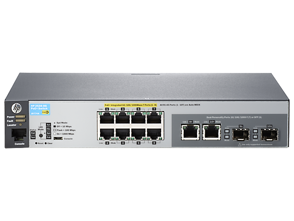 The HP 2530-8G-PoE+ Switch is a fully managed layer 2 switch with 8 10/100/1000 PoE+ ports and 2 dual personality ports.